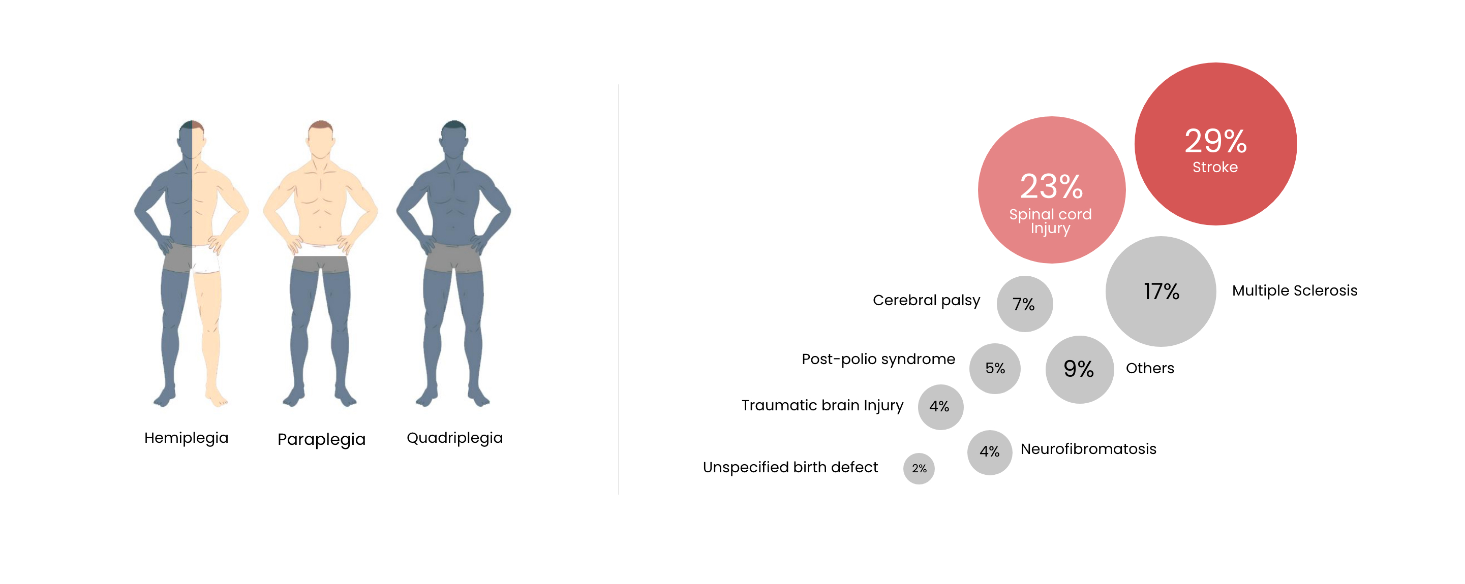 Stroke & injuries are the most causes for paralysis patients. See below figure for all causes.