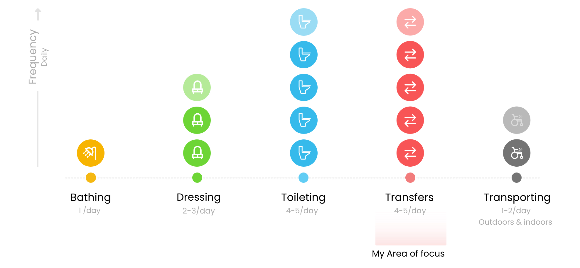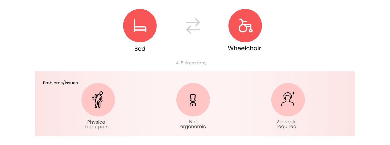 The focus area for me is transferring paralysed people at home from bed to wheelchair & vice versa, which affects the mental & physical well being of the caregivers. Let's see the transferring scenario with the problems faced by caregivers below in the diagram.