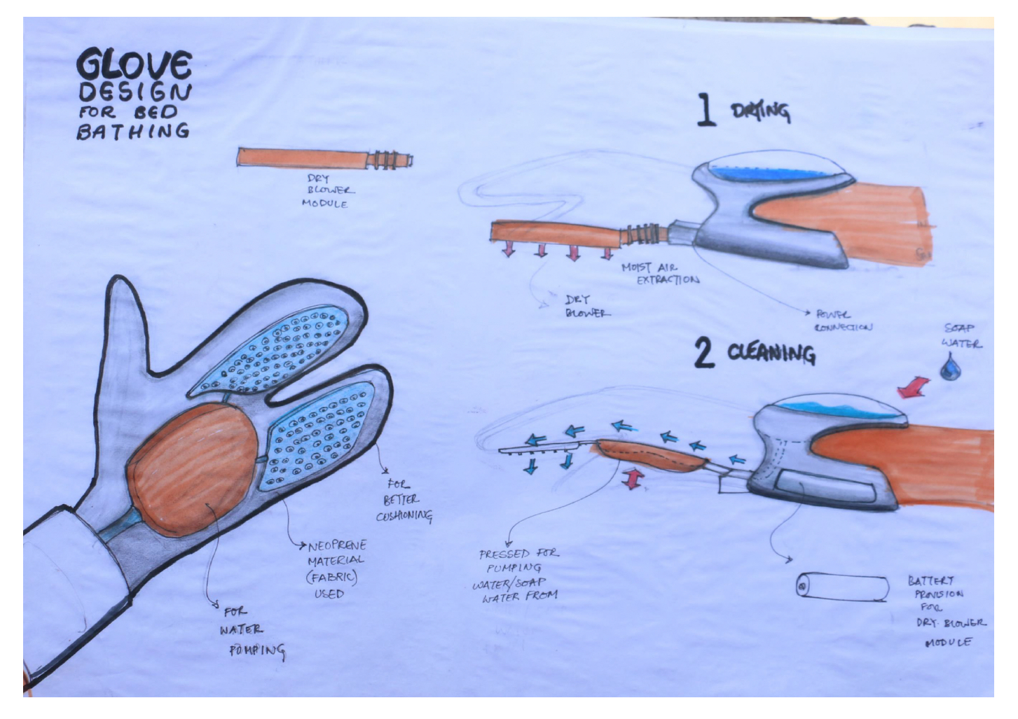 A caregiver bed bath's the paralysed member daily. So this concept is a glove design with the feature of wet cleaning & dry cleaning of the person, by putting soap water and normal water in the capsule above. Sponge is placed to eject soap water and normal water whenever required. After wet cleaning, replace the outlet with a blower module to dry the body.
