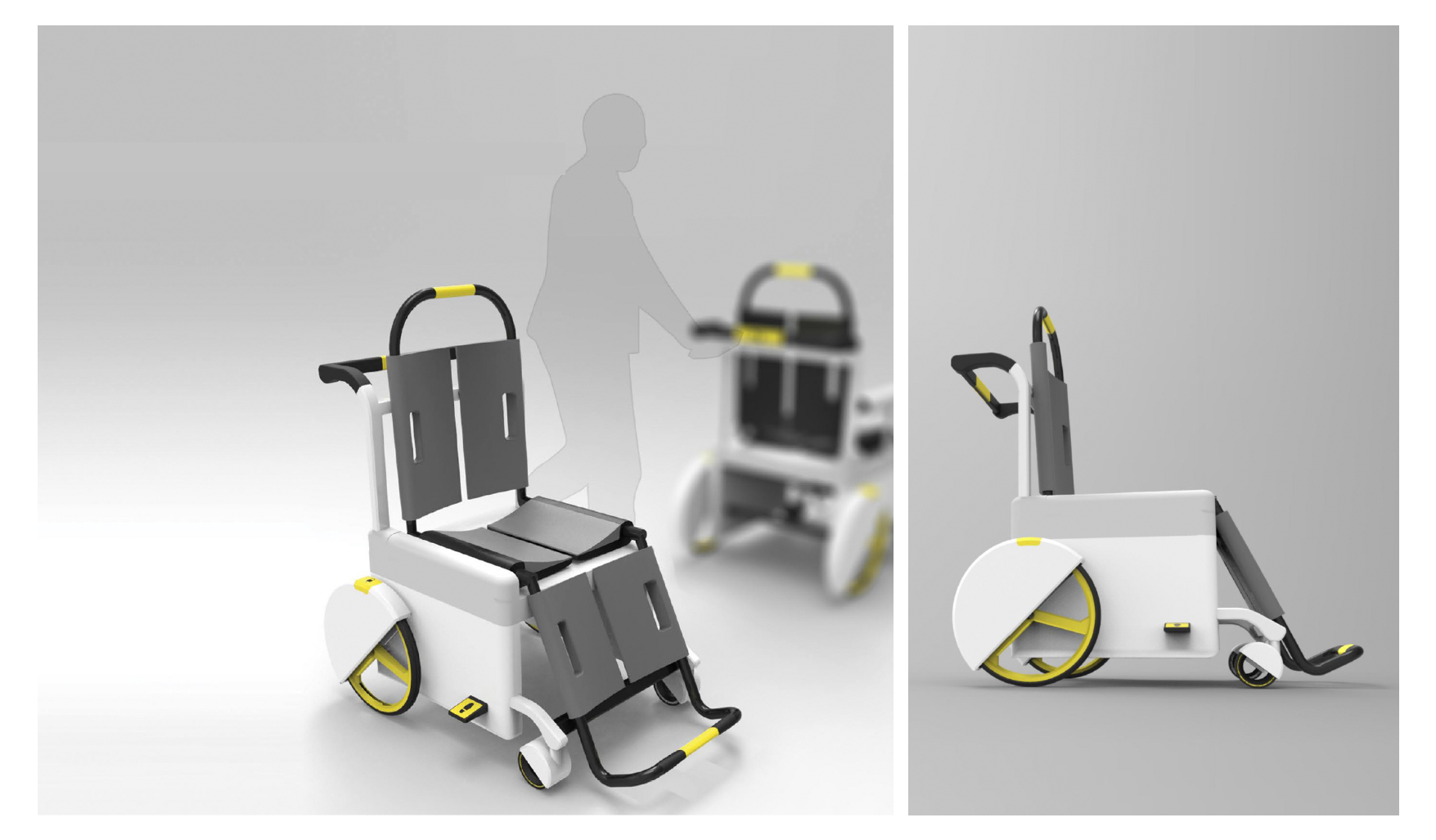 So, I redesigned the wheelchair with an integrated sliding scoop stretcher which folds and becomes a seating as well for the wheelchair. The design is done by considering the physical strain of the caregivers at homes.