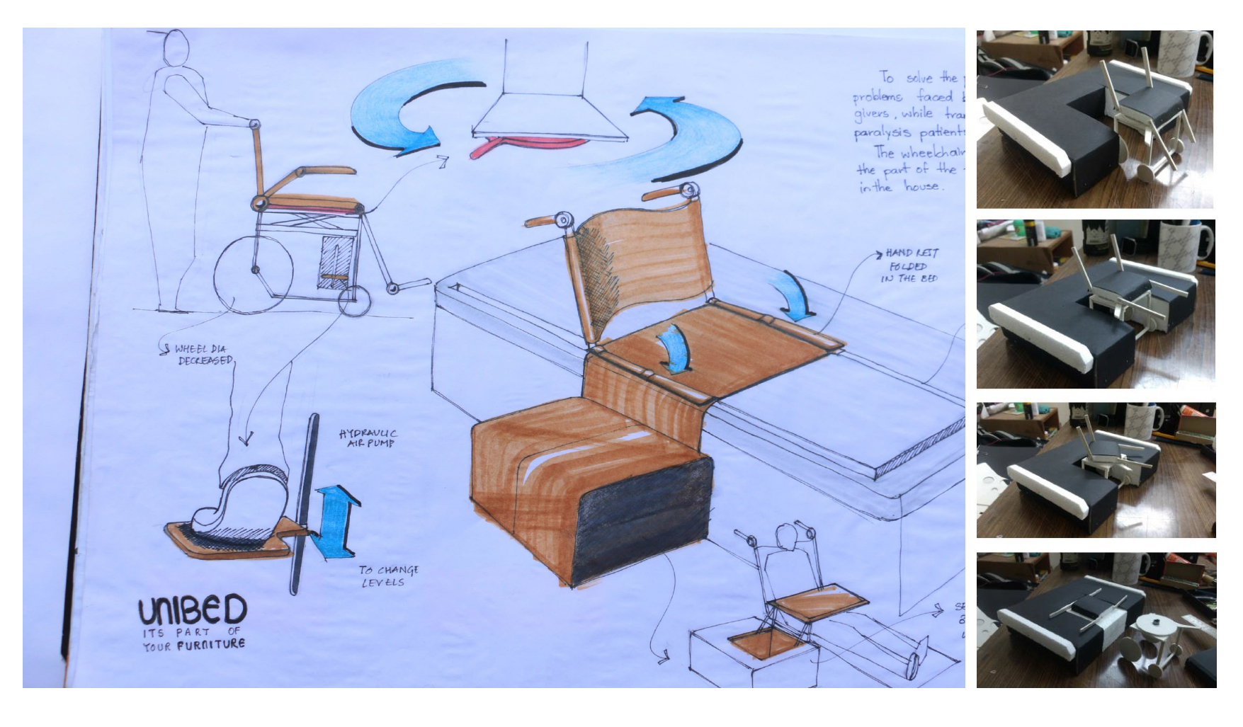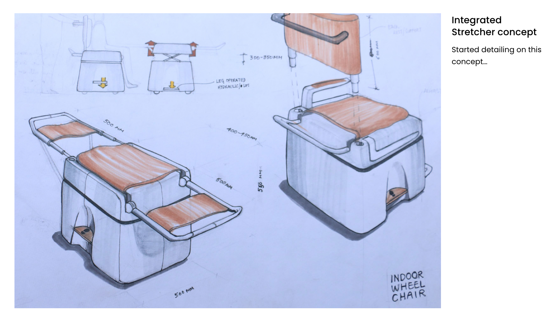 I started focusing on redesigning the wheelchair which solves the problem of transferring paralysed people laterally on beds and vice versa. So initially started concepts with integrating stretchers in wheelchairs and studying about them in detail.