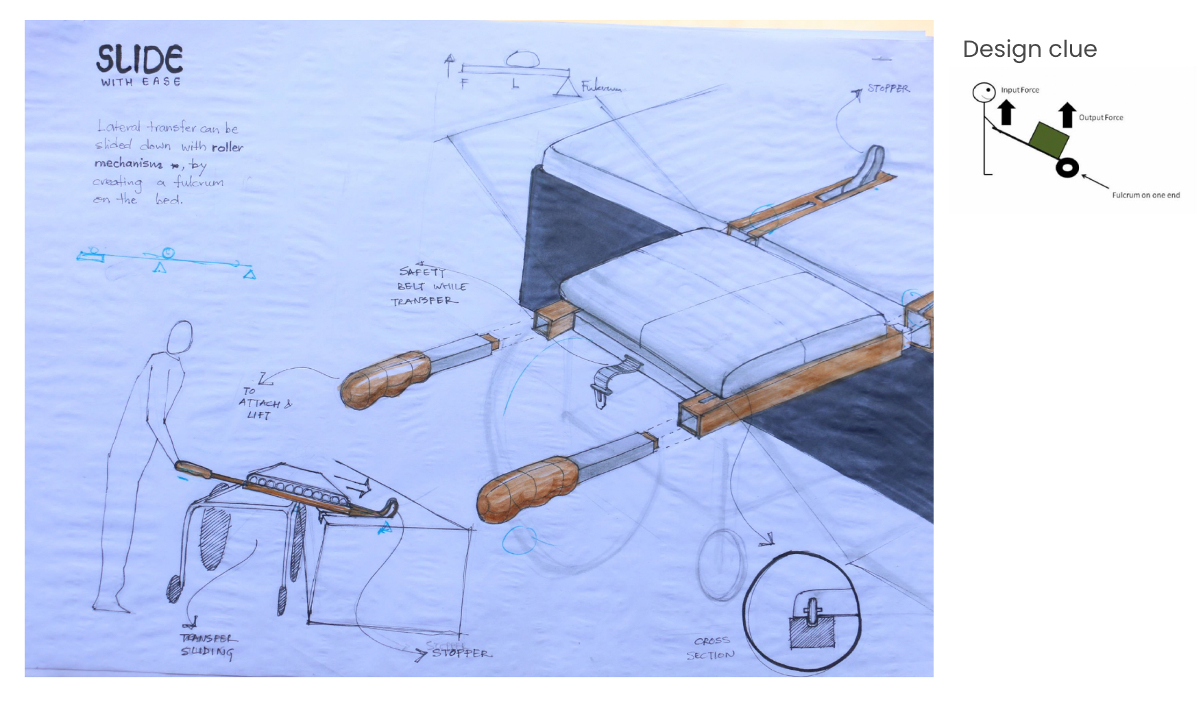 This concept is a wheelchair seat & bed redesign to slide paralysed person from wheelchair to bed, with the reference of fulcrum concept. Here lateral transfer can be down with roller mechanism. The stopper and rail is modified in the bed, so that it works with this concept.