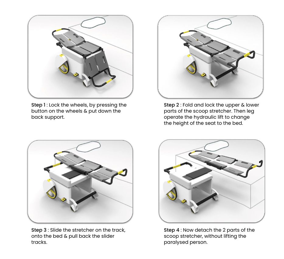 A wheelchair design, with a scoop stretcher integrated like a seating, which folds & slides on a rail to transfer paralysed people from wheelchair to bed & vice versa.